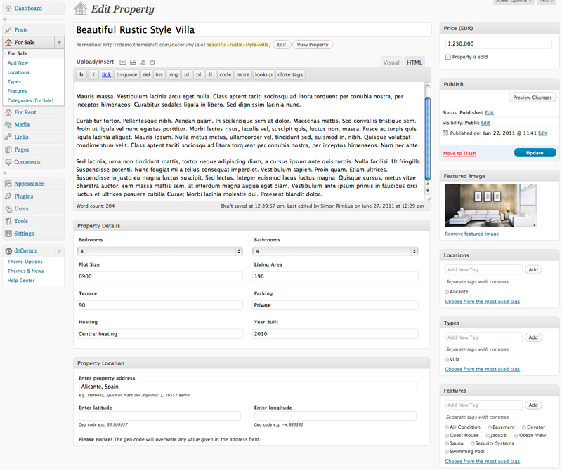 To be able to manage your properties in a convenient way deCorum comes with custom post types to completely separate real estate objects from posts and static pages.