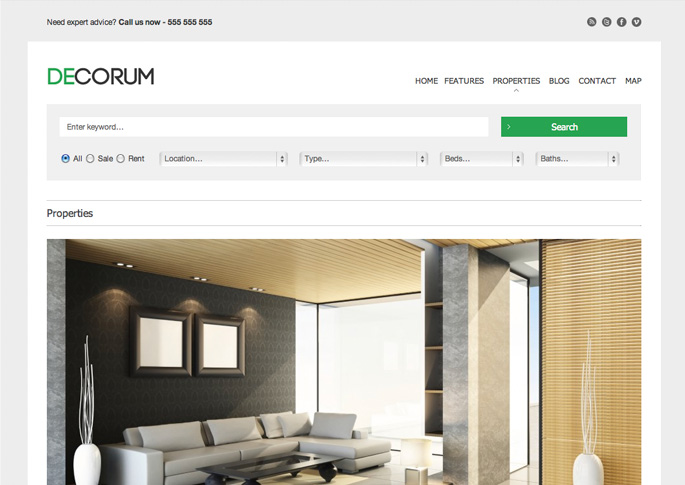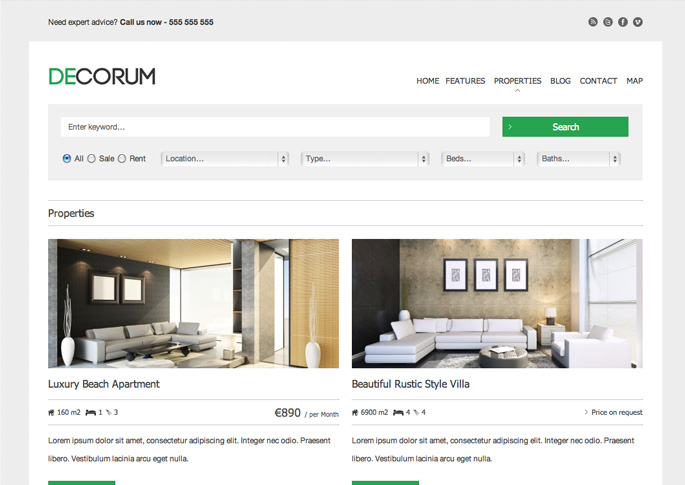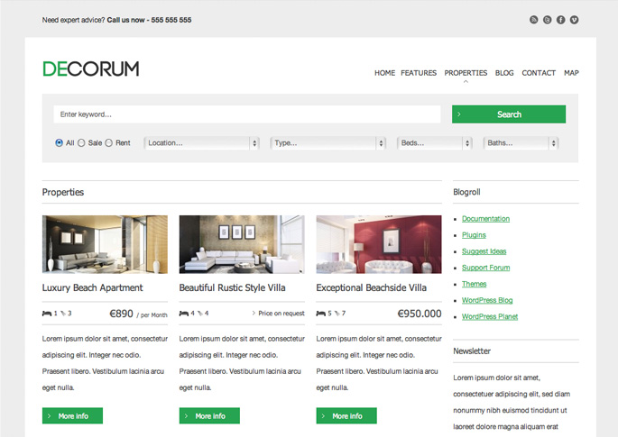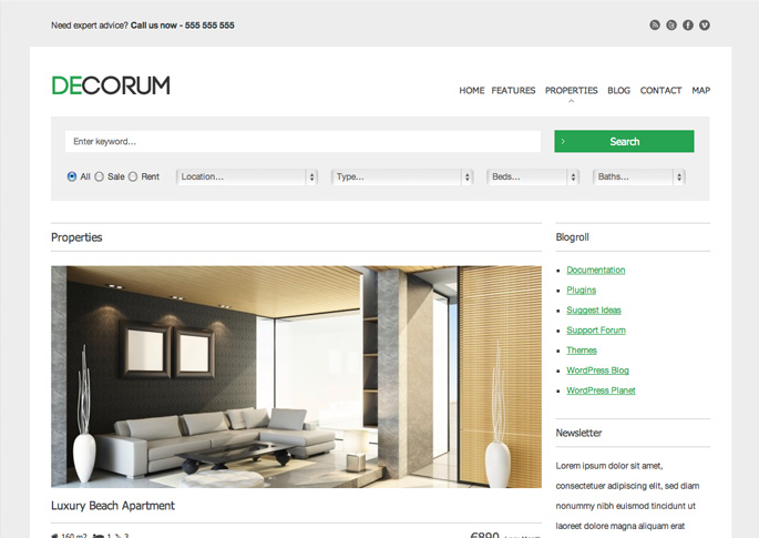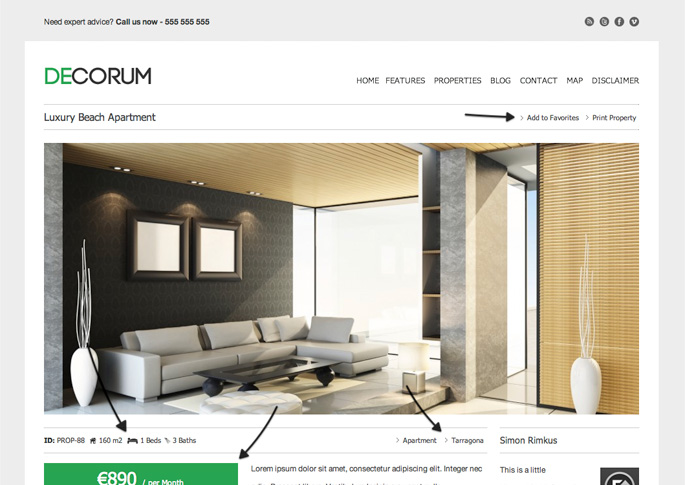 On the theme settings page you can also decide to display property and archive pages (separately) in different layouts with or without sidebar. Check out the following examples.