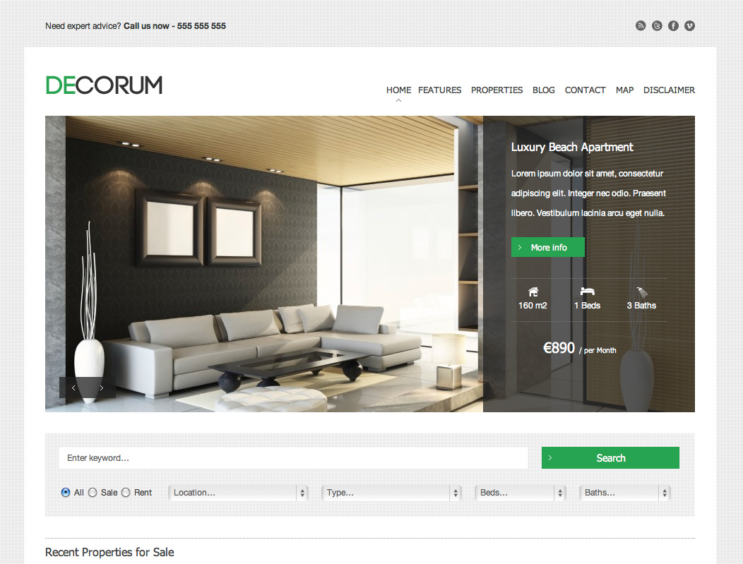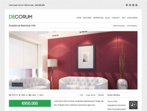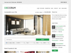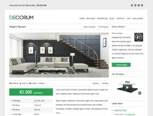 deCorum comes with a home page and a single property jQuery image slider in two layout variants each. There is a full width and a 2/3 width layout with sidebar.